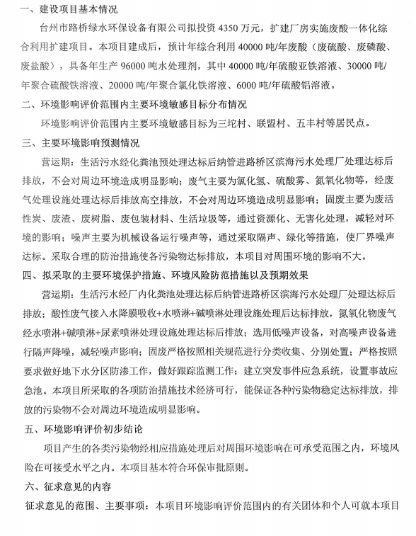 臺州市路橋綠水環保設備有限公司廢酸一體化綜合利用擴建項目環境影響評價信息公示